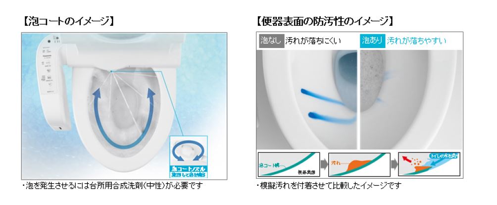 これにより泡の膜が便器内側の表面をコーティングすることで、便器への汚れがつきにくく、