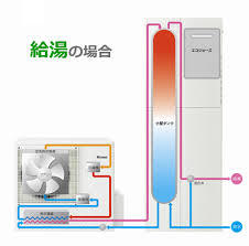見た目はエコキュートと変わりないのですが、タンクの上部分に給湯器(エコジョーズ)がセットされています。よくエコキュートとの違いを指摘されますが、エコキュートは電気代が安くなる深夜にお湯を沸かして、タンクにお湯をためて置くシステムです。ですから、タンク内のお湯が空っぽになってしまうとお湯が出なくなります。