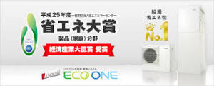 前回ご紹介いたしました、リンナイ 【エコワン】、メリットは、ランニングコストの安さです。エコキュートは、お湯を蓄えるために、大きなタンクが必要でしたが、エコワンはそれがありません。さらに、太陽光発電と組み合わせることもできますので、発電した電気をエコワンに使ってお湯を出すことが出来るので、ますます光熱費の節約ができます。また、平成25年 省エネ大賞を受賞しています。