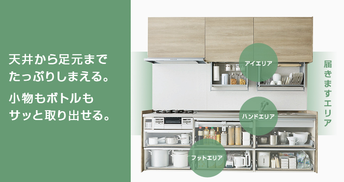 この他にもクリンレディで人気の手動で引き下ろせる吊戸棚「ハンドムーブ」もラクエラに搭載されました。
