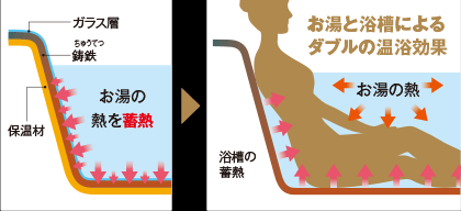 鋳物ホーロ浴槽は浴槽事態が蓄熱するので、お湯とのダブルの温浴効果があり、身体の芯までしっかり温まります!!