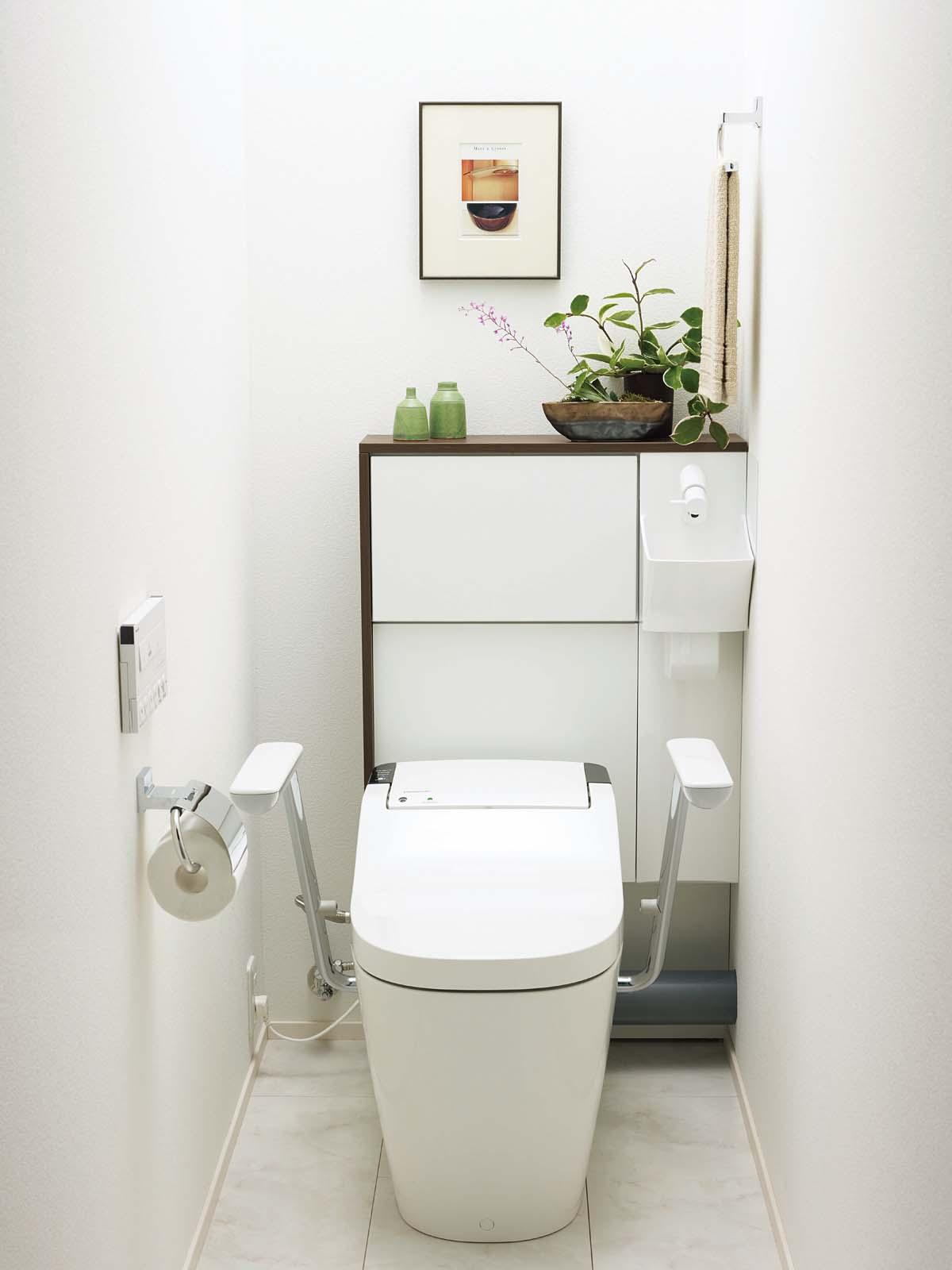 従来手洗い付きタンクがあった部分に、収納、カウンターを兼ね備た専用手洗いを設置することで