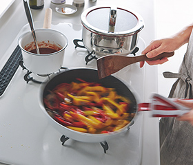 直径28cmのフライパンを振っても大丈夫。隣や奥のお鍋も気になりません。