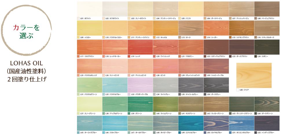 LOHAS OIL 国産木部用自然塗料の53色の中からお好みのカラーをお選び頂きます