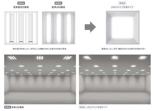 従来のスクエアシリーズでは、発光部の形状により、水平もしくは垂直方向に光源の方向性がありました。本シリーズでは、スクエアタイプの光源ユニットを採用したことで、面発光を実現。従来のような水平・垂直方向ともに光源の方向性がなく、光の広がりが均一です。シンプルなデザインのため空間にマッチし、すっきりとした照明空間になります。