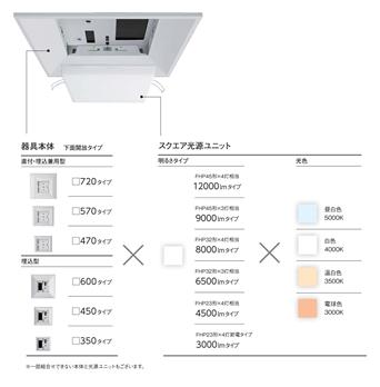 器具本体は直付・埋込兼用型の720・570・470タイプ、埋込形の600・450・350タイプの6タイプをラインアップ。スクエア光源ユニットには、明るさタイプは12000lm・9000lm・8000lm・6500lm・4500lm・3000lmタイプの6タイプ、光色は昼白色(5000K)・白色(4000K)・温白色(3500K)・電球色(3000K)の4タイプから組み合わせます。