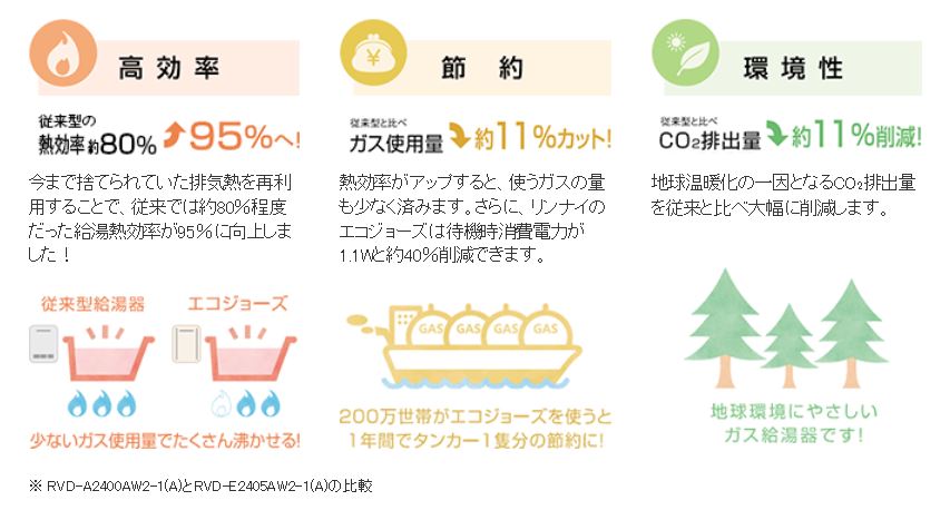 「エコジョーズ」とは、少ないガス量で効率よくお湯を沸かす省エネ性の高い給湯器です。
