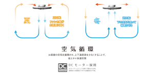 ファン回転方向を切り替えることができるので、夏に適した下向きの風で下に溜まる涼しい空気を循環させたり、逆回転で冬に適した上向きの風を創り、上に溜まった暖かい空気を下におろすことができます。