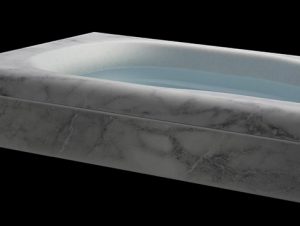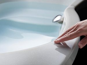 バスタブ用にしつらえた人造大理石の「エクランシリーズ」は、体をあずけた時の心地よさを生む厚みのある人造大理石に、表面には超平滑性樹脂層「ゲルコート」を成形。