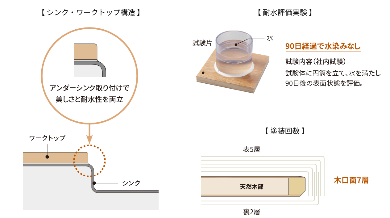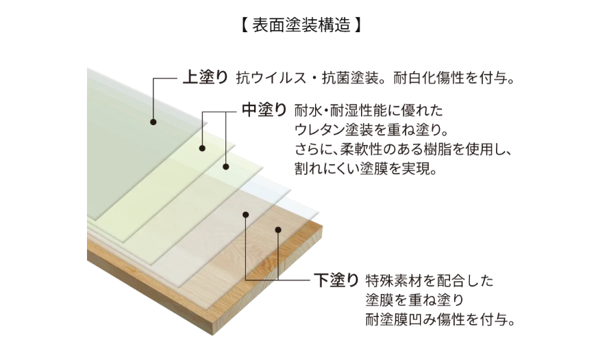 ▼最大7層のウレタン塗装で天然木を水から守る