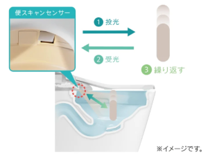 便スキャンセンサーで落下中の便をスキャンし、便の形(硬さ)・色・量を自動でチェック!