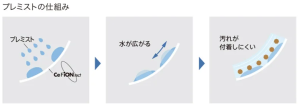 便器表面に水の膜を作り便器ボウル面にミスト(水)を自動でふきかけ、汚れを付きにくくしてくれます。