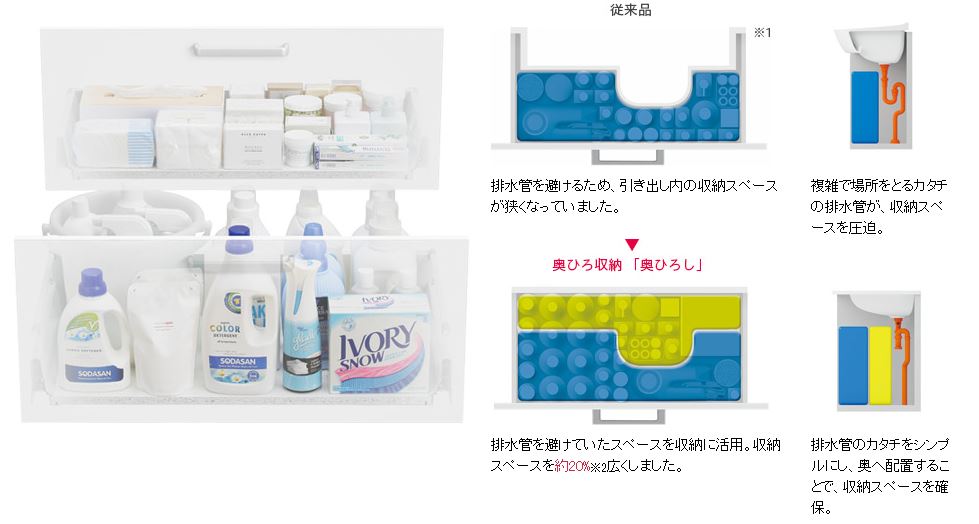 収納量が大幅にUPする独自のキャビネット「奥ひろし」も、もちろん標準装備です!