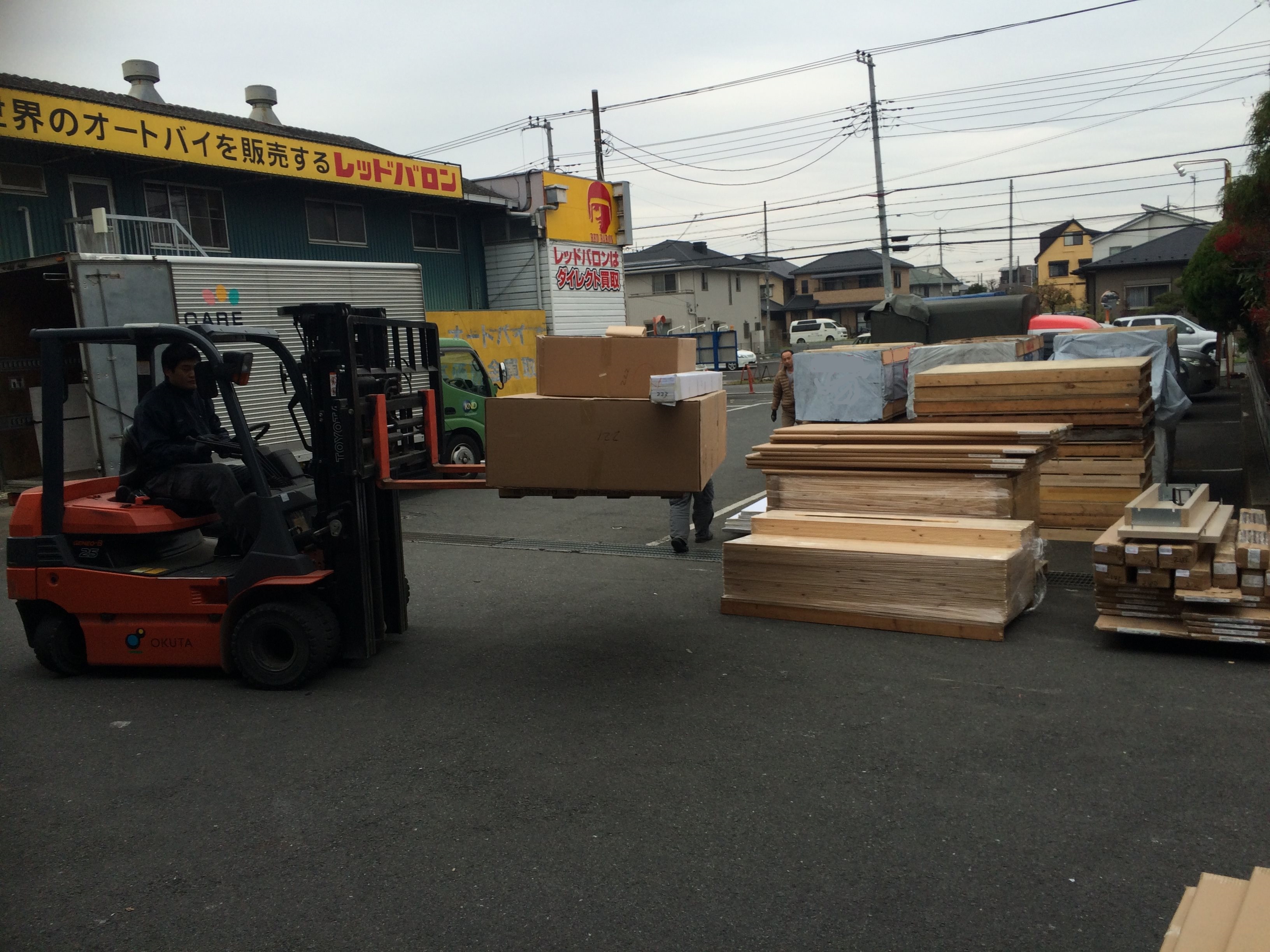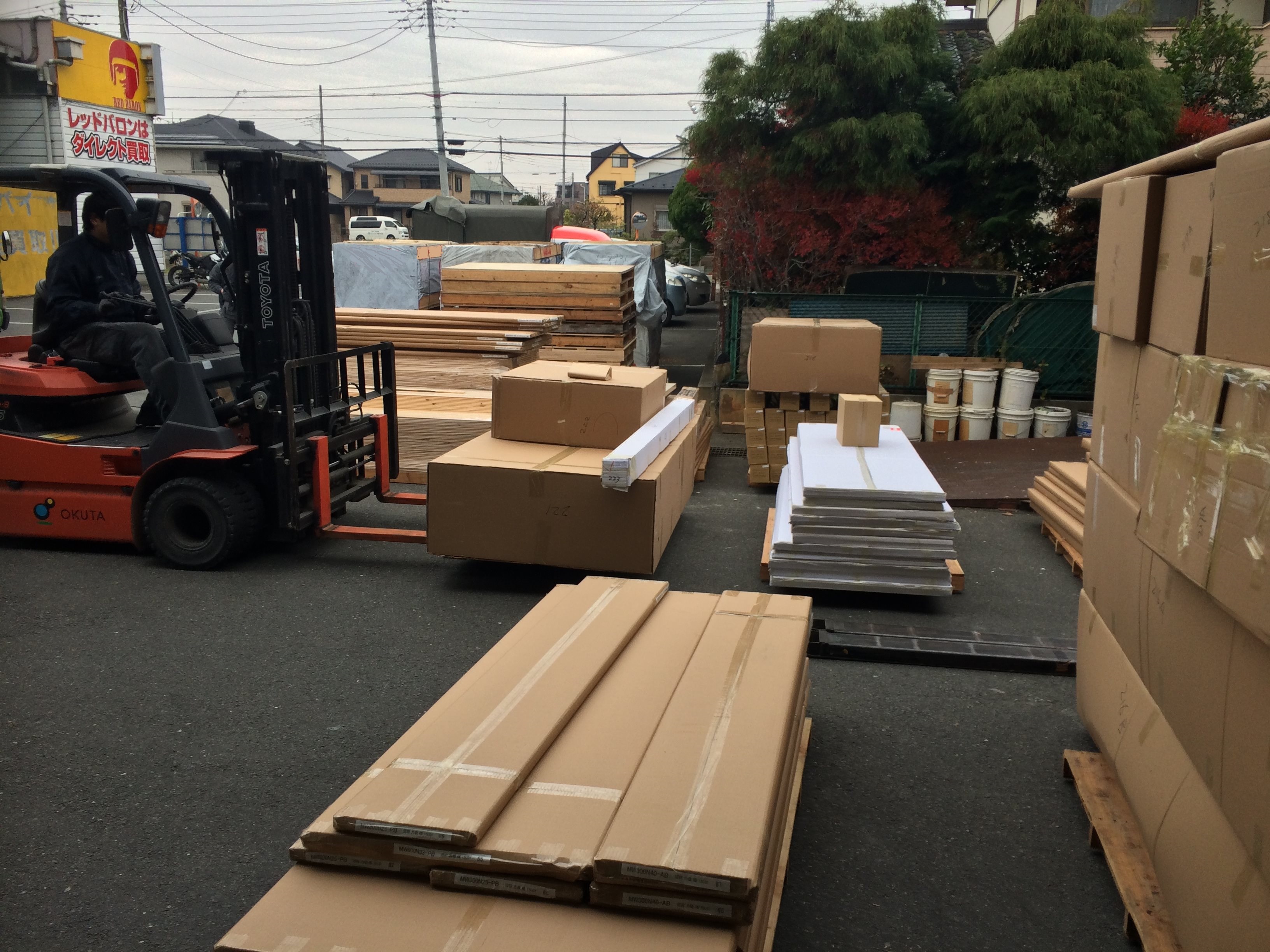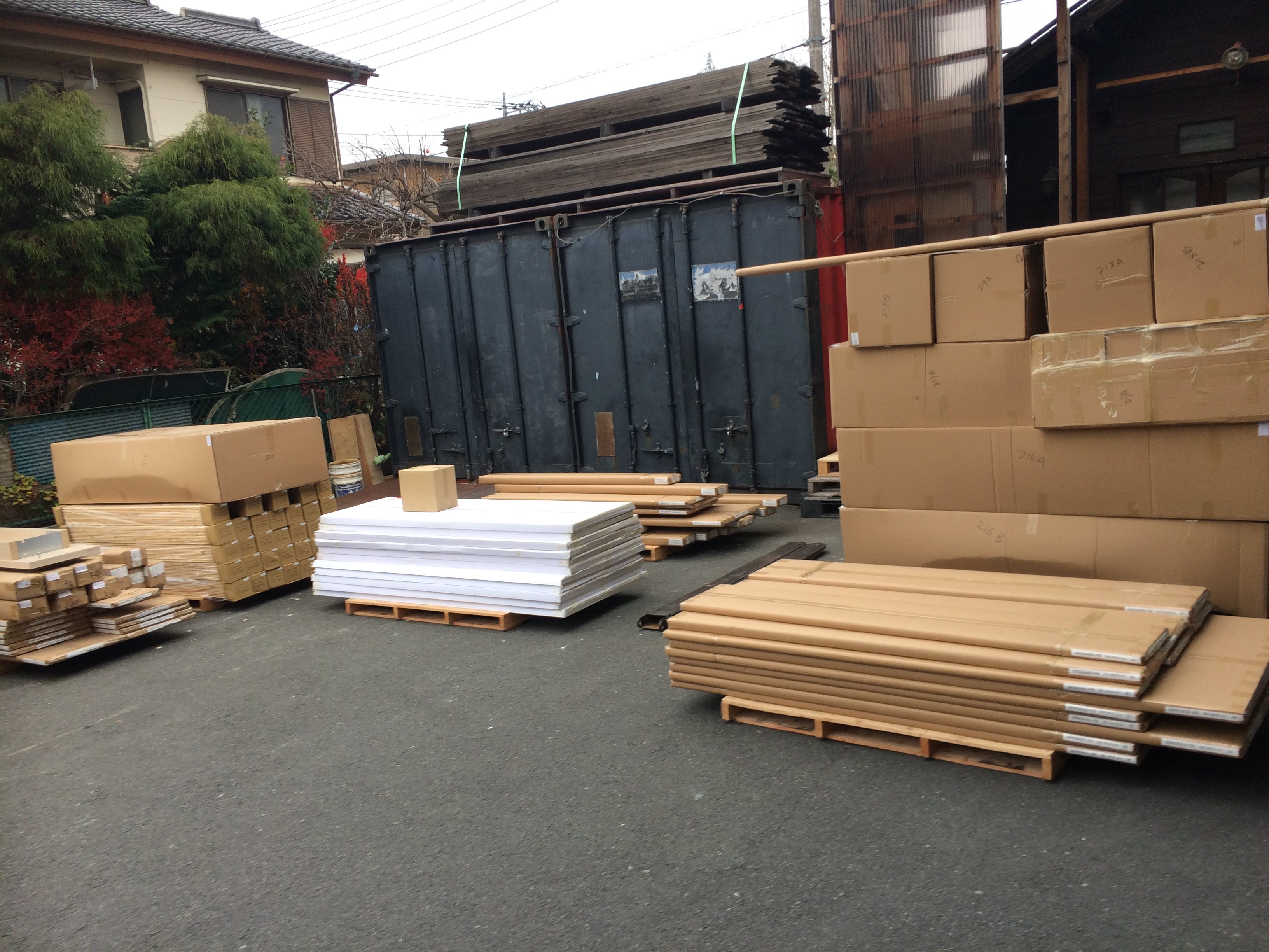 14日は海外からのコンテナを荷卸し、検品したほかに、多量の珪藻土、床材なども入荷しました。