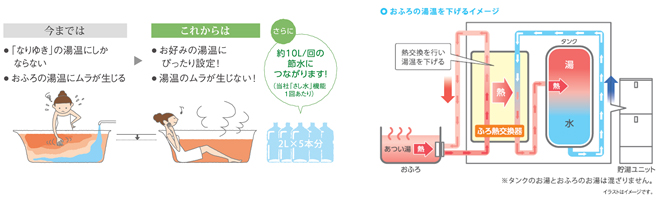 「温浴セレクト」機能は、お風呂のお湯の「熱」だけを貯湯タンクに戻すことで、
