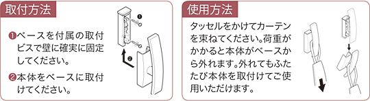 こちらは安心してカーテンを使っていただくために、荷重がかかると本体が外れる機構のタッセル用部品とふさかけです。