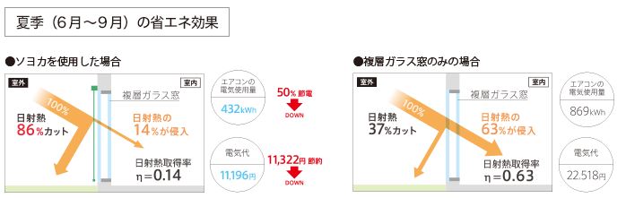 室内に差し込む日射をカットする事で室内気温の上昇を防ぎ、夏季(6~9月)のエアコン電気使用量を約50%節電と、とってもエコ。