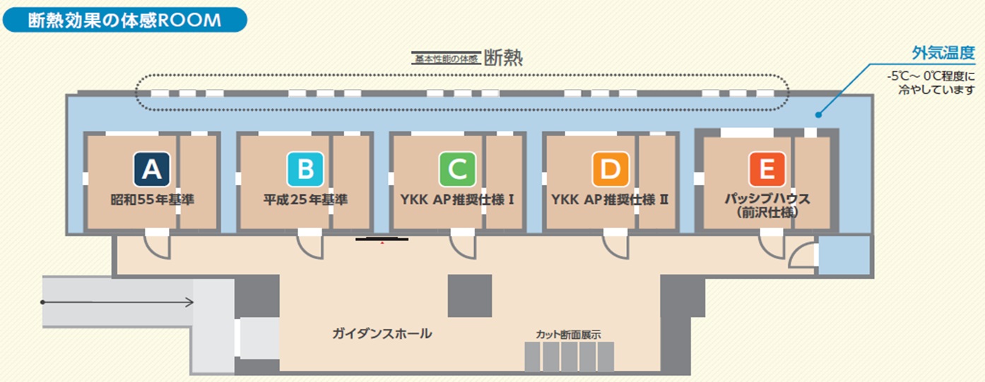中でも、 断熱効果については、 冬の外気温を想定した巨大な冷凍庫の中に、 20年以上前の一般的な断熱仕様(壁・床・窓)の部屋(窓は単板ガラス入りアルミサッシ)から、 最新の高断熱仕様の部屋(窓は高性能トリプルガラス樹脂窓「APW430Kr」)まで5つの断熱仕様の部屋を設けて、その性能を 全身で比較体感することができます。