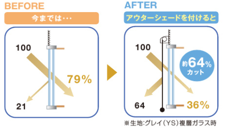 今ある複層ガラスにアウターシェードを設置した場合、全ての生地で60%以上の日射をカットします。