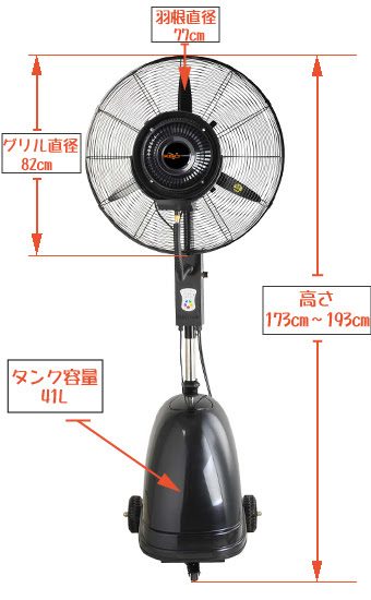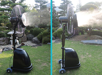 そこで、お勧めの商品が【ミストファン】です。水をミクロ単位の極小な霧状にして高出力の扇風機で空中に噴霧すると、その極小のきりが空中で一気に帰化し、空気中の熱を奪って気化するため、大気中の温度が3℃~5℃下がります。その噴霧冷却効果で、屋外に広い範囲で空気の温度を下げてくれるわけです。