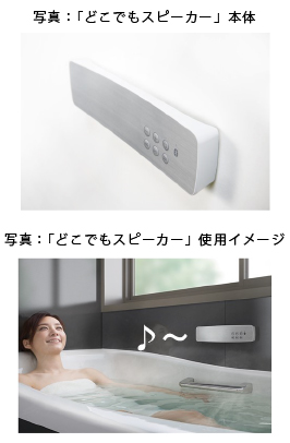 「どこでもスピーカー」は、マグネットがくっつくというホーローの特性を活かし、ホーロー製の浴室の壁面にBluetooth内蔵スピーカーをくっつけて、音楽が楽しめるという仕組みです。音楽が壁面に振動して他の壁面まで伝わり、響き渡るため、浴室全体がまるでサラウンドスピーカーのようになることが特徴です。