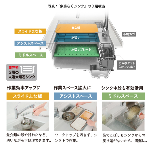 それらを実現するために、スライドまな板・アシストスペース・ミドルスペースからなる業界初のアクリル人造大理石製3層シンク設計を導入しています。