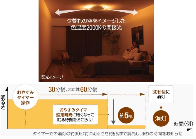 就寝シーンを演出する「くつろぎのあかり」の2モードを搭載した
