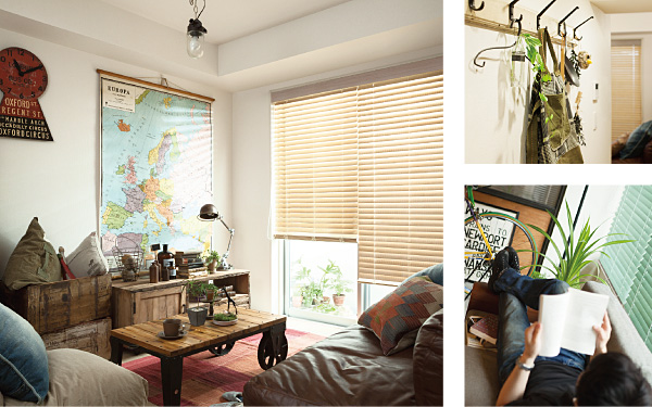 カジュアルかつユーズド感のあるデザインは、木製家具やファブリックを使った