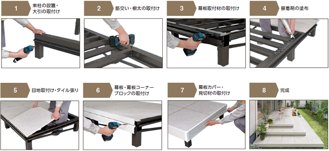 アルミフレームの基礎部材に接着剤でタイル張りを行うことで、モルタル施工と養生期間をなくし、施工性にも優れています。