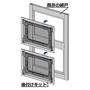 「カートリッジ網戸 後付けキット」は、すでに取り付けてあるパネル網戸に内側から取り付ける事ができる網戸で、網戸部分だけを外すことができる為、清掃も簡単に行うことができます。