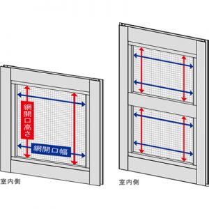 網戸を室内側から見て、網が付いている部分(網開口)の内側の寸法が「網開口幅」・「網開口高さ」となります。