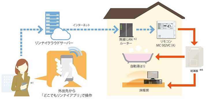 このサービスは、給湯リモコンMBC-302VC(A)またはMBC-301VC(A)と自宅の無線LANルーターを接続し、お持ちのスマートフォンに「どこでもリンナイアプリ」をインストールすることで使用が可能になります。