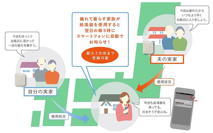 離れて暮らす家族の給湯器使用状況を翌朝スマートフォンに通知