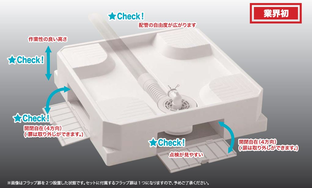 フラップ扉(側面のカバー)を開けるだけで、洗濯機を設置した状態でカンタンに漏水確認ができます。