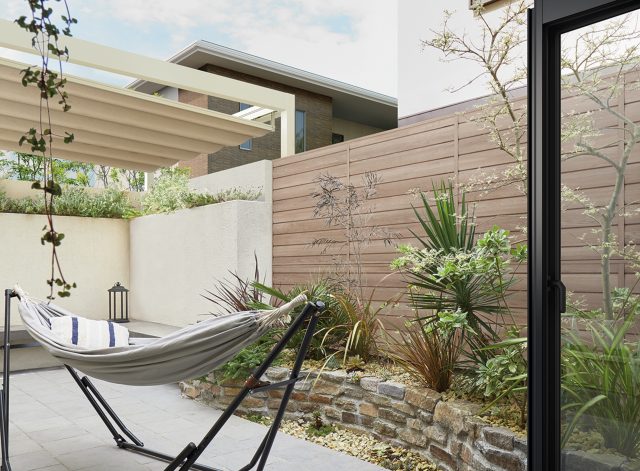 柱のキャップといった目にとまりやすい部分には木調キャップを標準装備。「開き門扉AA」も、家側・外側の両面が木調となるよう、框やフレームも木調ラッピングで覆った。