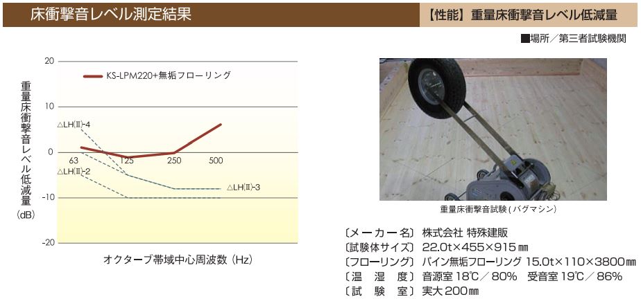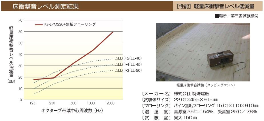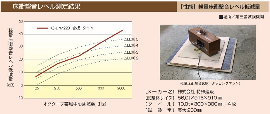防音・遮音材の厚さは〔わずか22mmで防音性能 ⊿ LL(1)-4(LL-45) を達成〕しています(第三者試験機関にて測定)