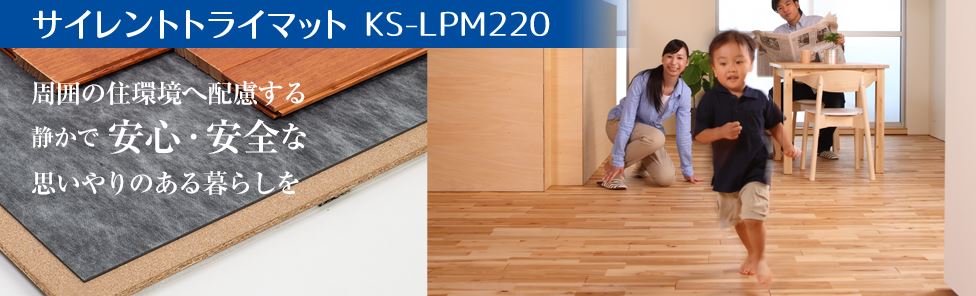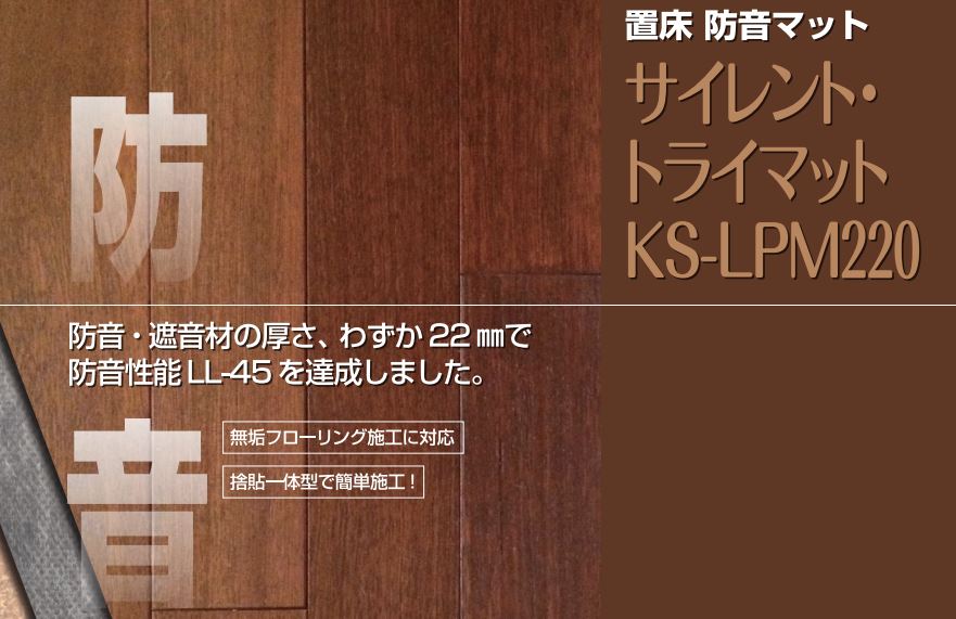 OK-DEPOTでは置き床工事が難しい場合、マンションなどの集合住宅への施工に最適化された直張りタイプの捨貼一体型の防音・ 床下地材である「サイレント・トライマット KS-LPM220」をお勧めしております。