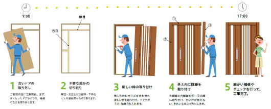 上から新しい枠や額縁でカバーして新しいドアを取り付ける商品です。