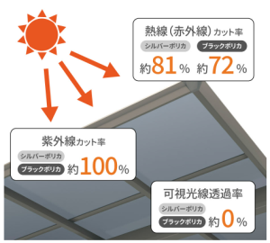 ブラックポリカと同等の高い遮熱効果(赤外線カット率 約81%)を持ちながら、