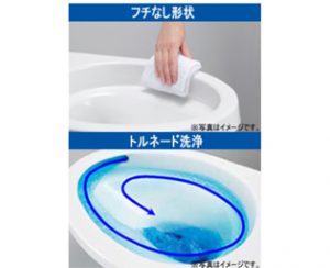 ・フチなし形状により、サッとお掃除もしやすく、また渦を巻くような水流、トルネード洗浄により汚れを洗い流します。