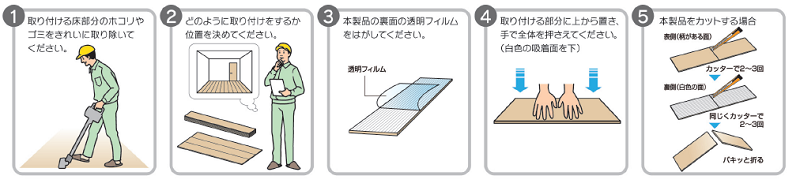 「吸着フローリング」は建築業界で初めてフロア基材と吸着材を組み合わせた、厚さ4mmのリフォーム専用床材です。一般的な製品は、釘や接着剤を使用して床材を下地に固定しておりますが、「吸着フローリング」は、裏面の透明フィルムを剥がして上から手で全体を押さえるだけで、吸着面が下地に固定されるため、一般の方でも簡単に施工が行えます。また、製品のカットはカッターナイフなどで容易に行えますので、施工中に大きな騒音を発生させることもありません。