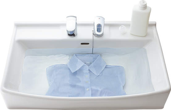 ・フランジを薄くしたスクエア形状の陶器ボウル。水栓の両サイドには小物が置けるフラットなスペースを設けてあります。