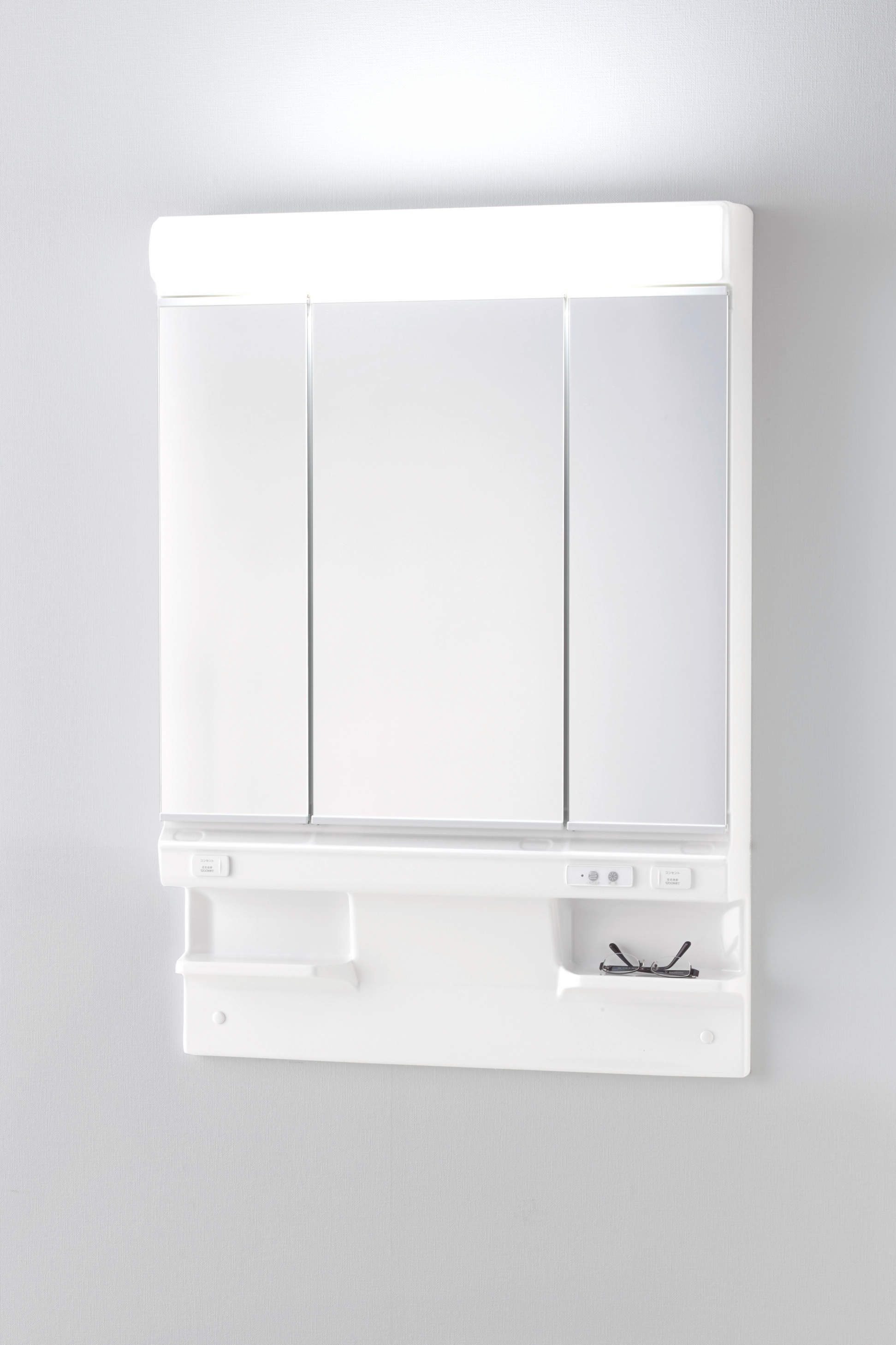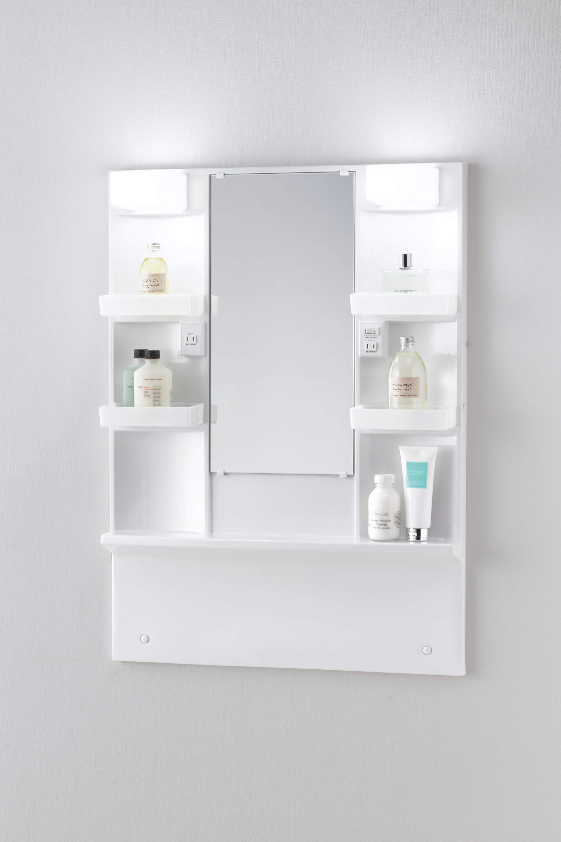 ・1面鏡ミラーキャビネットには、ミラーの左右に1カ所ずつ、計2カ所のコンセントを設置。ミラーの下には、奥行き約9cm(センター部)のフラットな仮置き棚を用意。