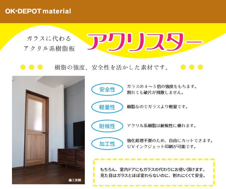 そんな方におススメなのが、ガラスに替わるアクリル系樹脂板の『アクリスター』です。