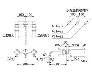 取り付け穴径スパウト、ハンドル:Φ31から32mm