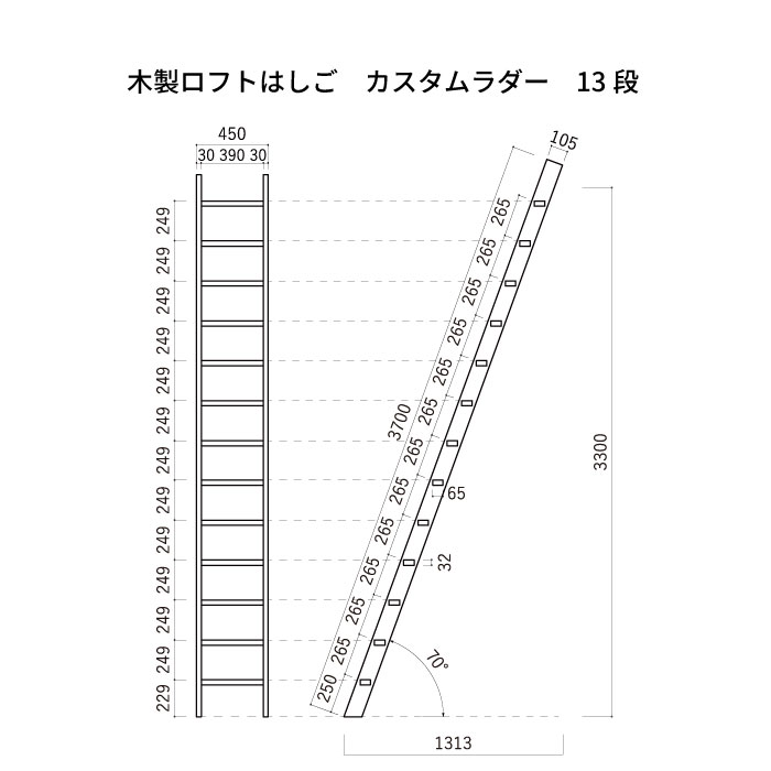 ロフトはしご カスタムラダー 木製ロフトはしご 正面手すり仕様 クリア塗装 金具セット 13段の説明