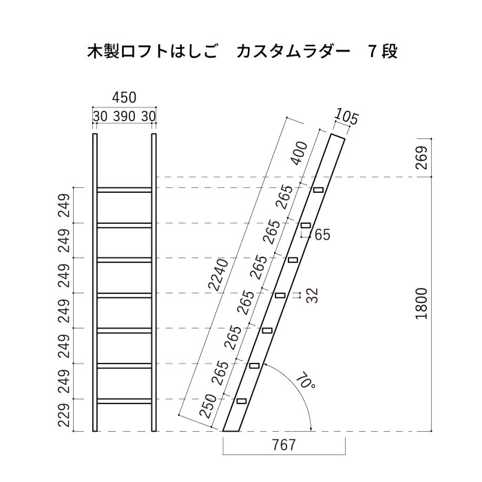 ロフトはしご カスタムラダー 木製ロフトはしご 正面手すり仕様 クリア塗装 金具セット 7段の説明