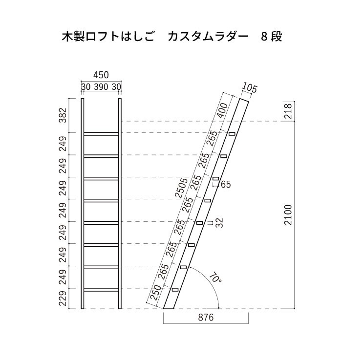 豊富な段数を取り揃えているため、底床のロフトベッド用から屋根裏への移動用まで用途に合うものがきっと見つかります。さらに、ご自分でカットして微調整できるのもポイントです。はしごの横幅は450mmと広く、専用の手すりも付けられ、安全性や昇降しやすさにも配慮したこだわりの商品です。