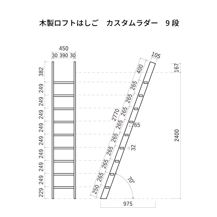 豊富な段数を取り揃えているため、底床のロフトベッド用から屋根裏への移動用まで用途に合うものがきっと見つかります。さらに、ご自分でカットして微調整できるのもポイントです。はしごの横幅は450mmと広く、専用の手すりも付けられ、安全性や昇降しやすさにも配慮したこだわりの商品です。