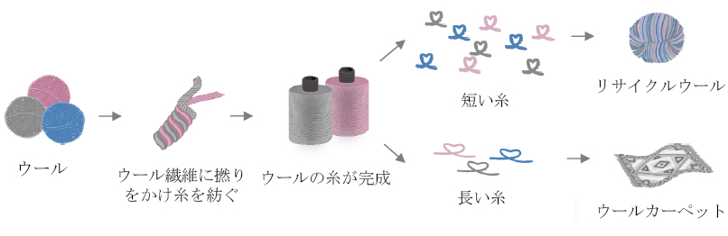 ウールカーペット製造時には製品に使用されない短い糸(ウール繊維)が発生します。